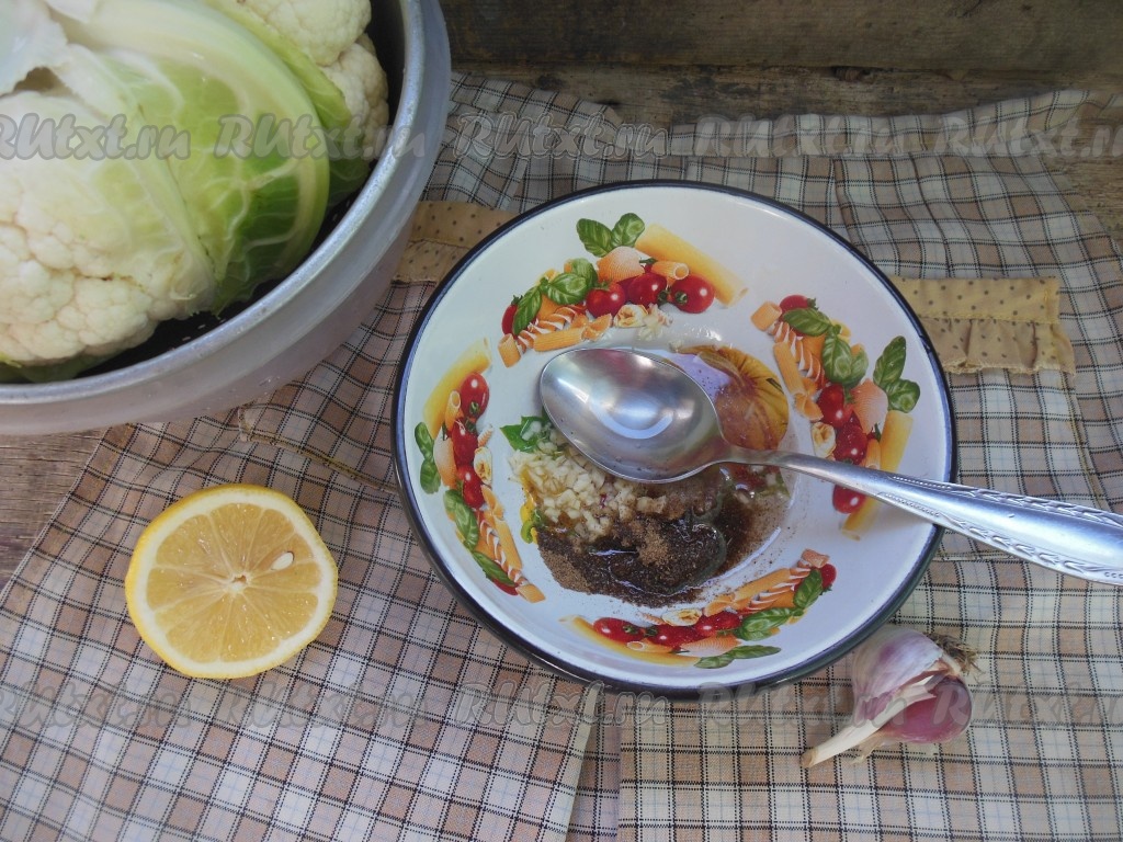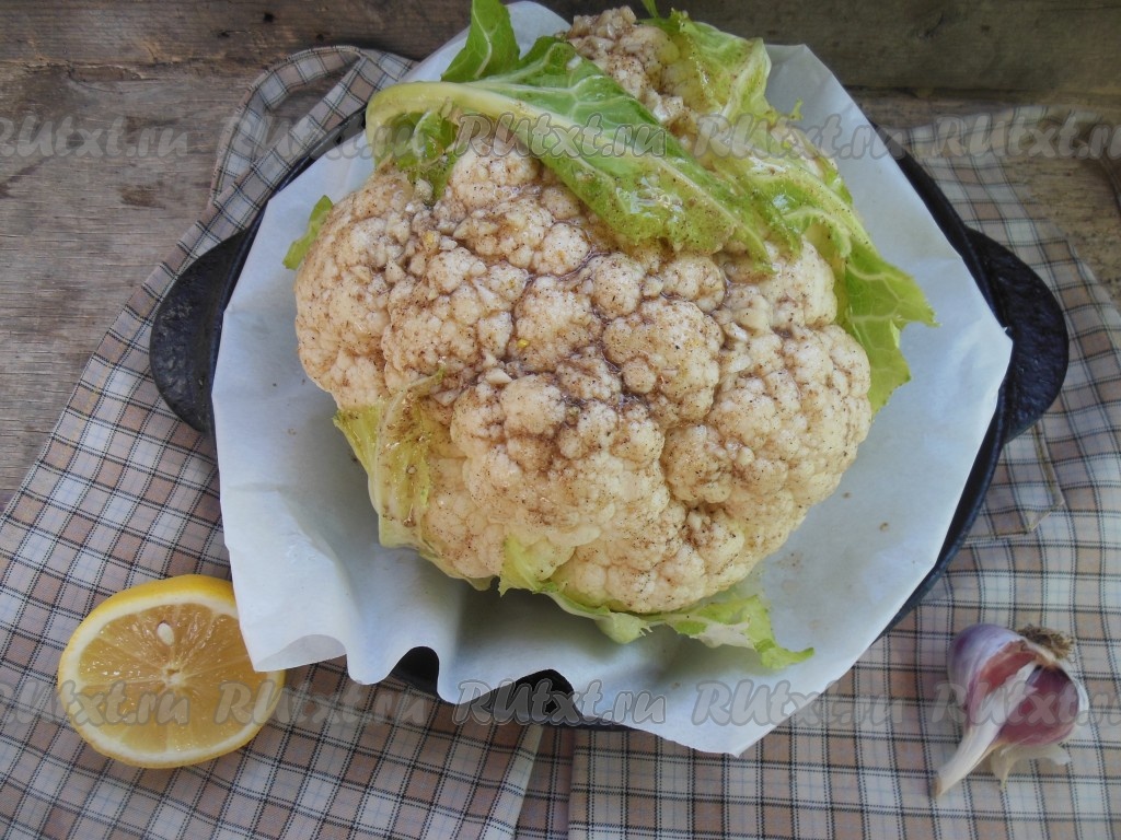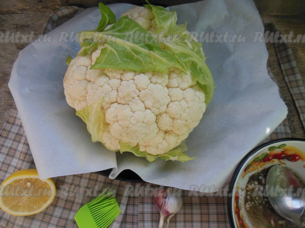 С помощью силиконовой кисточки обмажьте кочан цветной капусты смесью растительного масла, чеснока, соли, черного перца и лимонного сока.