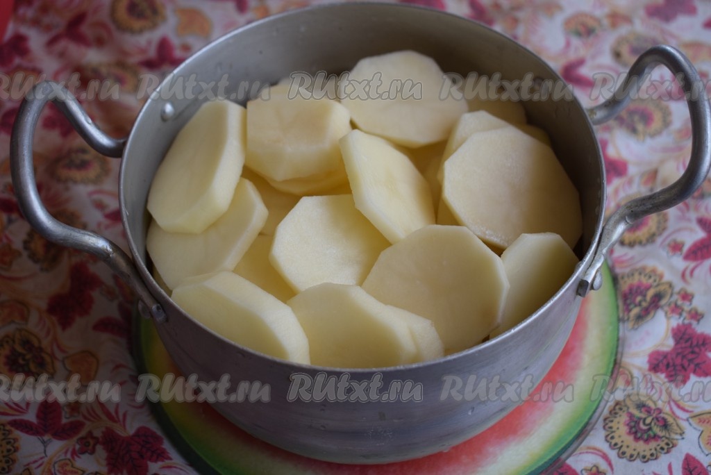 Картофель очистим от кожуры и нарежем на кружочки толщиной, примерно, 4 мм.