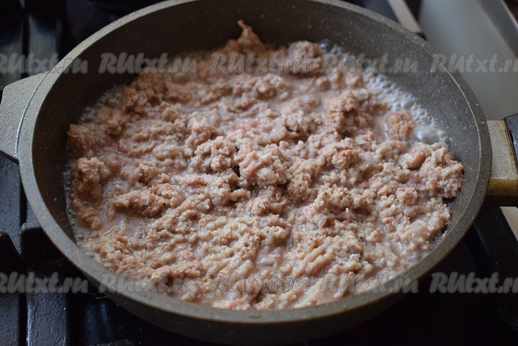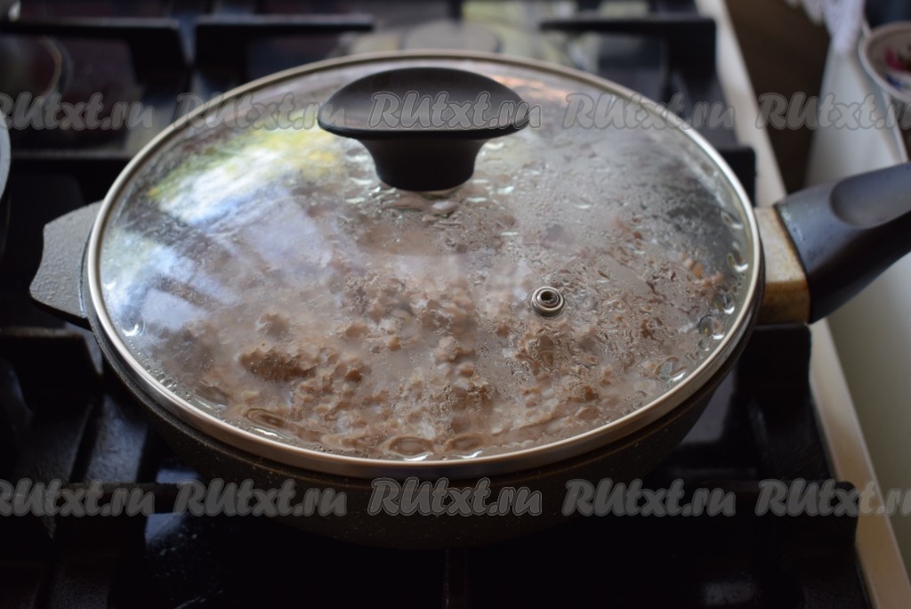 Огонь делаем слабым и тушим фарш до готовности (примерно, минут 15, фарш должен полностью изменить свой цвет), накрыв сковороду крышкой, периодически разбивая мясные комочки. Готовому фаршу даём остыть.
