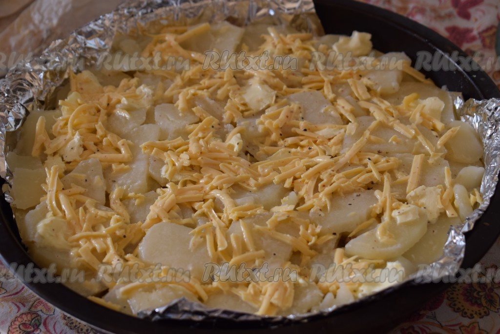 Заливаем оставшейся заливкой, равномерно распределяя сыр по всей поверхности картофельно-мясной запеканки.