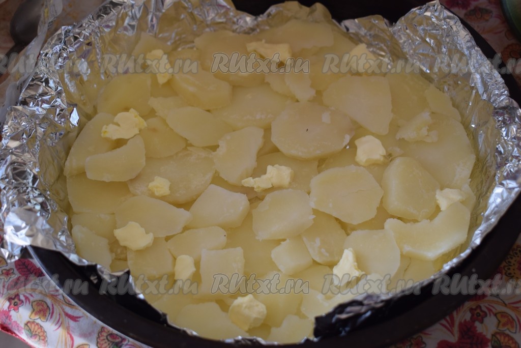 Приступаем к сборке картофельно-мясной запеканки. Для этого в форму диаметром 24 см застилаем пергаментом или фольгой. На фольгу (или пергамент) выкладываем половину кружочков картофеля, сверху выкладываем грамм 15 сливочного масла, разделённого на небольшие кусочки.