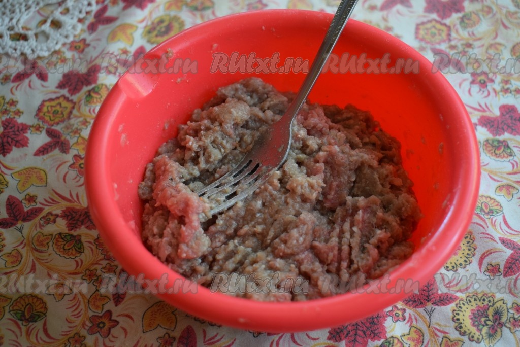 Фарш для этого блюда можно взять покупной или приготовить домашний. Для приготовления домашнего фарша нужно пропустить через мясорубку кусочки мяса и очищенный лук (я на 550 грамм мяса беру 150 грамм лука), затем посолить, поперчить фарш по вкусу и тщательно перемешать.