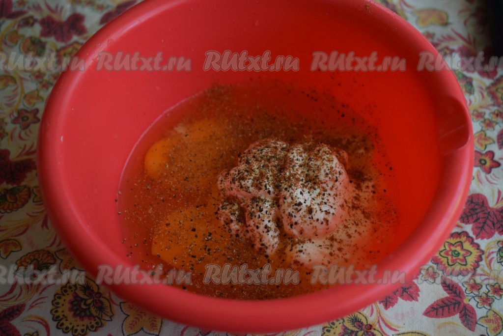 Подготовим заливку для нашей картофельно-мясной запеканки, для этого в миске смешаем яйца, сметану и воду, добавим соль, чёрный молотый перец.