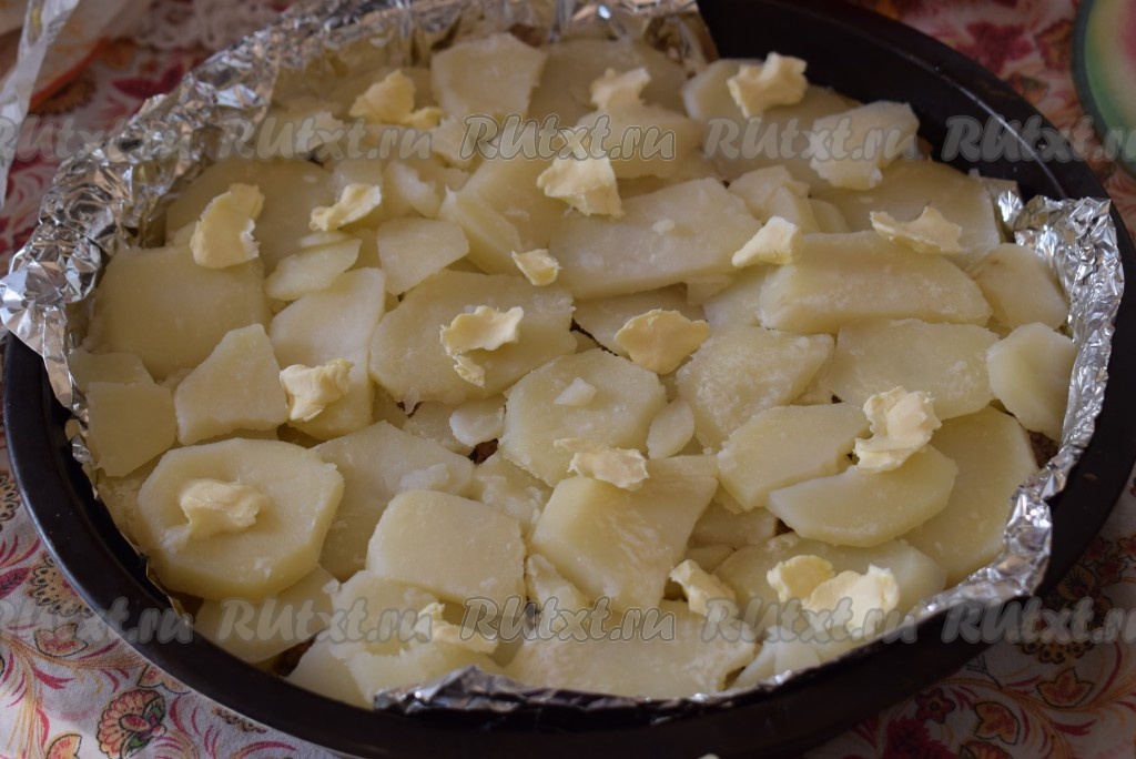 Поверх фарша снова кладем слой картофеля, сверху выкладываем кусочки оставшегося сливочного масла.