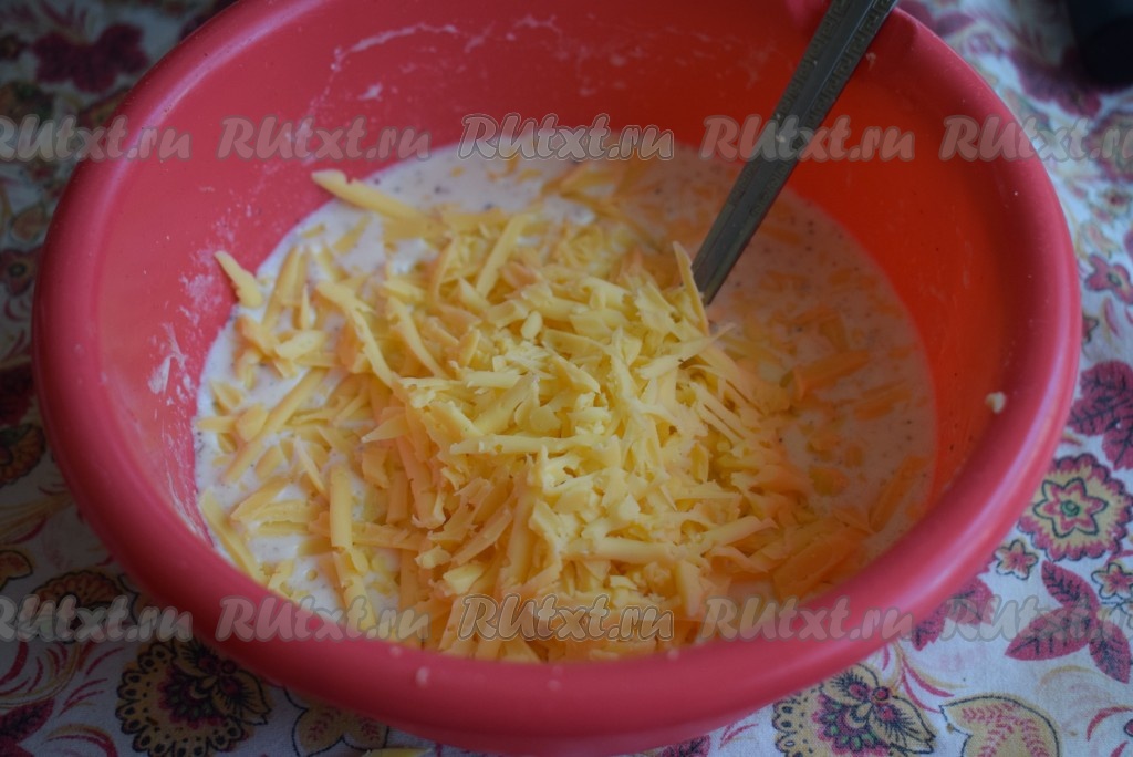 Натрем сыр на крупной терке и добавим в сметанно-яичную смесь, еще раз перемешаем и заливка готова.