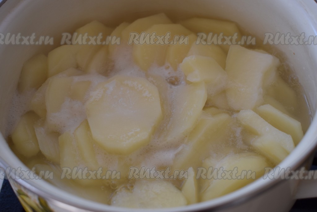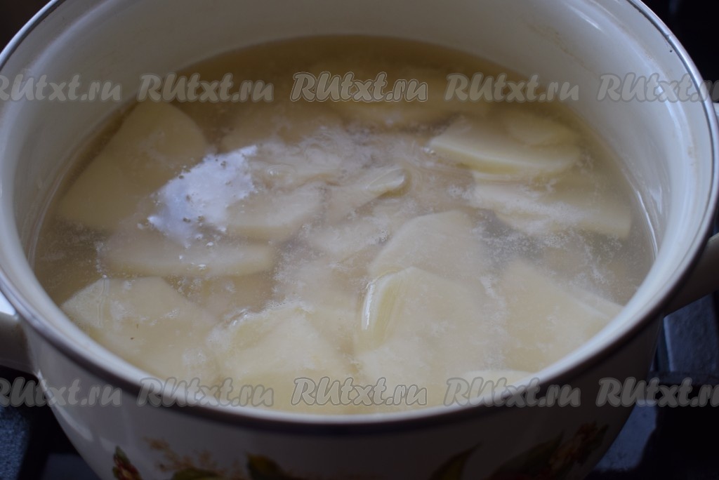 В кастрюле вскипятим воду, опустим нарезанный картофель в кипяток. Когда картофель закипит, подсолим его по вкусу.
