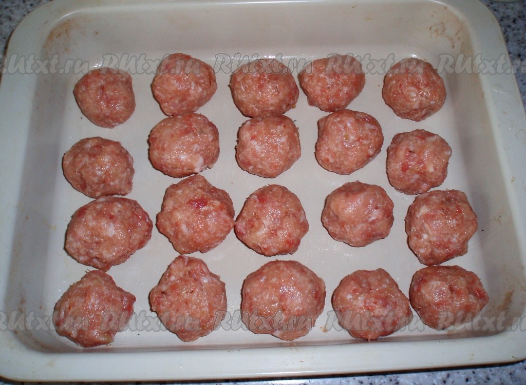 Сформировать мокрыми руками фрикадельки размером с грецкий орех или чуть крупнее и выложить их в форму для запекания.