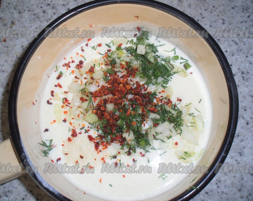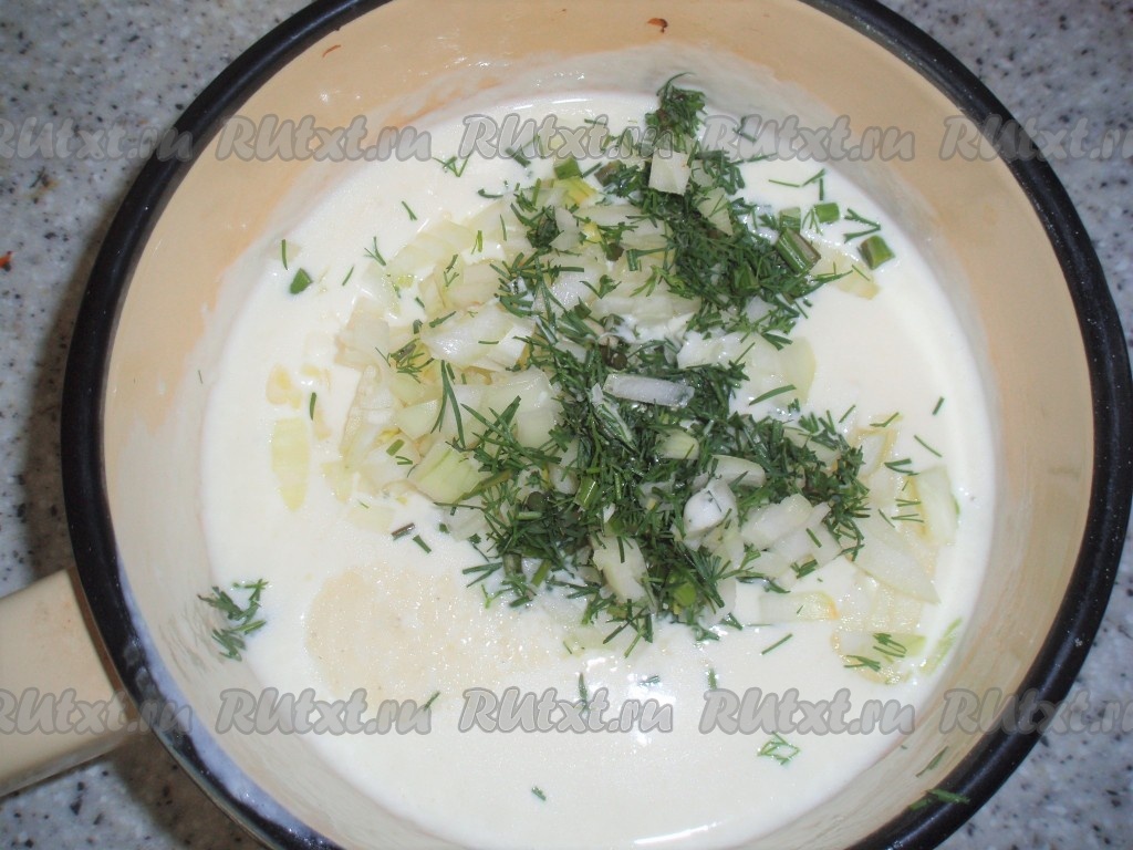 Зелень укропа вымыть, измельчить, добавить в соус.