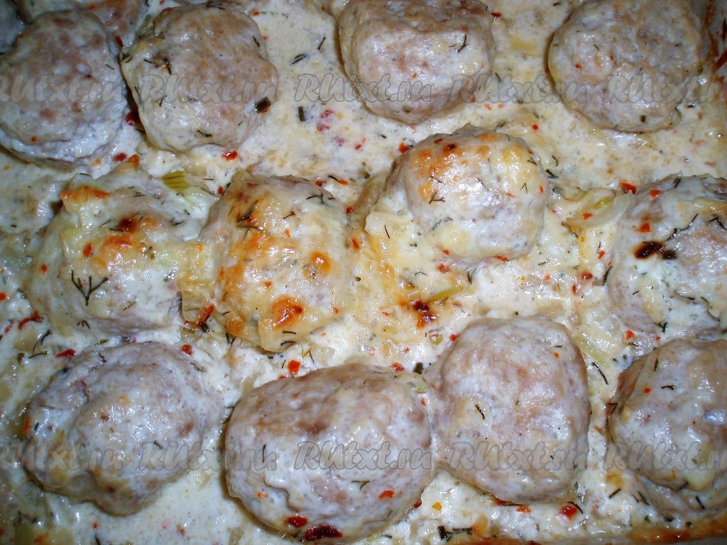 Поместить форму с фрикадельками в сливочно-сырном соусе в духовку, предварительно нагретую до 180 градусов. Запекать до готовности. Мои фрикадельки были готовы через 35 минут.