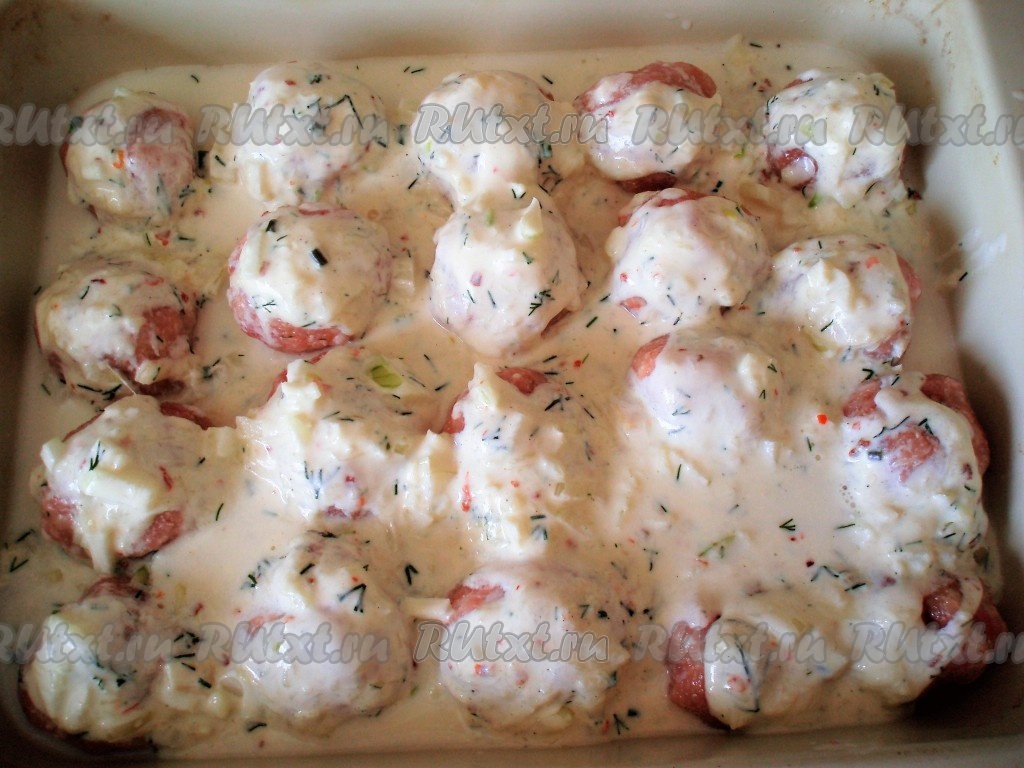 Все ингредиенты соуса перемешать, по необходимости, посолить и добавить чёрный молотый перец. Залить приготовленным соусом фрикадельки.