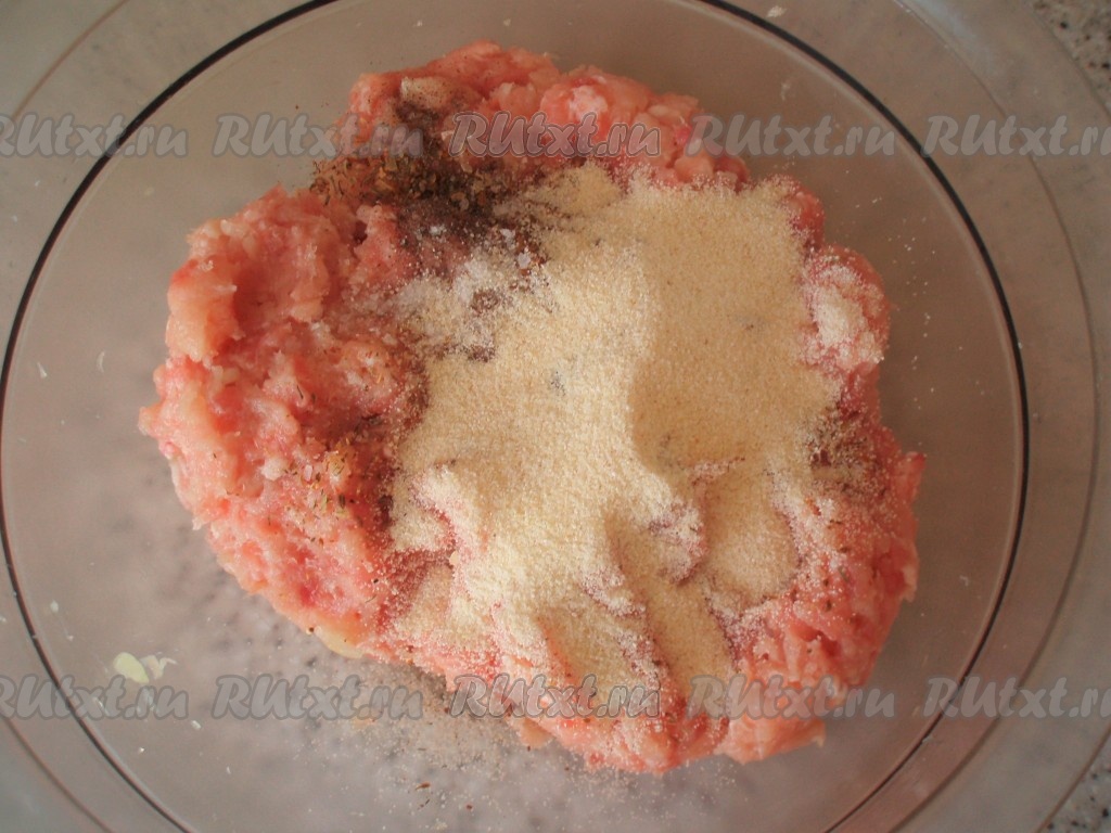 Приготовить фарш. Я приготовила смешанный фарш из курицы и свинины в соотношении 50:50. К фаршу добавить яйцо, манную крупу, соль, чёрный молотый перец и специи для мяса, если их используете.