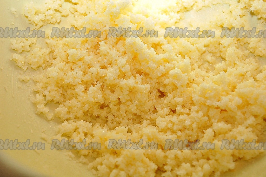 Взбивать масло с сахаром до состояния крошки.