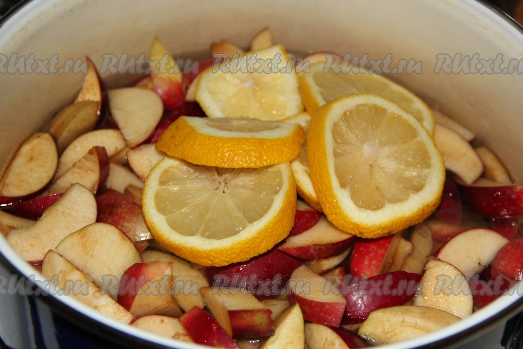 Лимон вымыть и нарезать крупными колечками, добавить в кастрюлю.