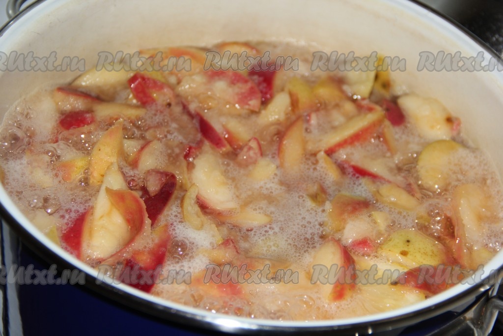 Поставить кастрюлю на огонь и довести до кипения. Варить яблоки на среднем огне до размягчения. У меня сезонные яблочки с огорода, поэтому через 7 минут они начали разваливаться. Если яблоки жёсткие, поварите их подольше.