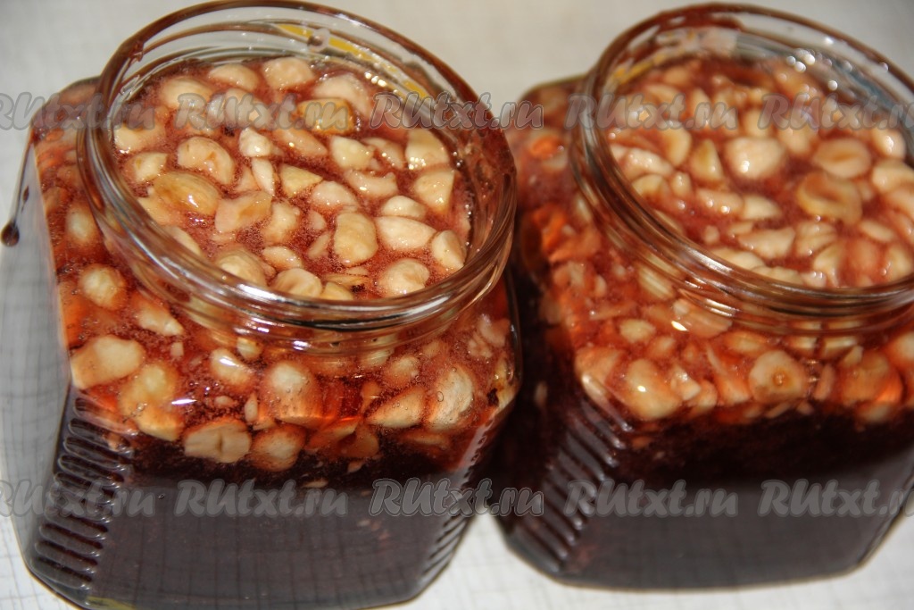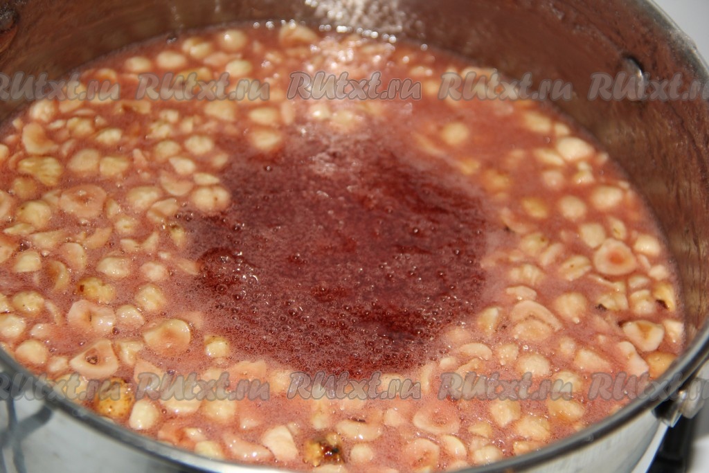 Первое время я снимала пенку, затем сироп стал чистым и прозрачным. За 2-3 минуты до окончания варки добавить в кастрюлю лимонную кислоту и орехи. Я добавила очищенный фундук. Орехи крупно порубила. Количество орехов можно увеличить, я добавила 1 стакан.