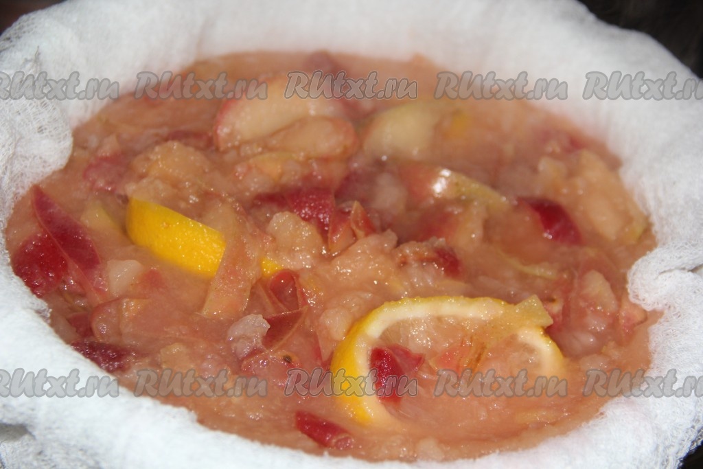 Дуршлаг проложить марлей в несколько слоёв. Как только яблоки размягчились, откинуть их на дуршлаг. Нам понадобится жидкость от яблок, а сама мякоть, лимон и жмых нам не нужны и в дальнейшем мы это выкинем.