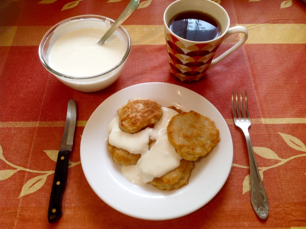 Наши картофельные оладьи с куриным фаршем готовы! Подаём их со сметаной и зовём семью к столу!