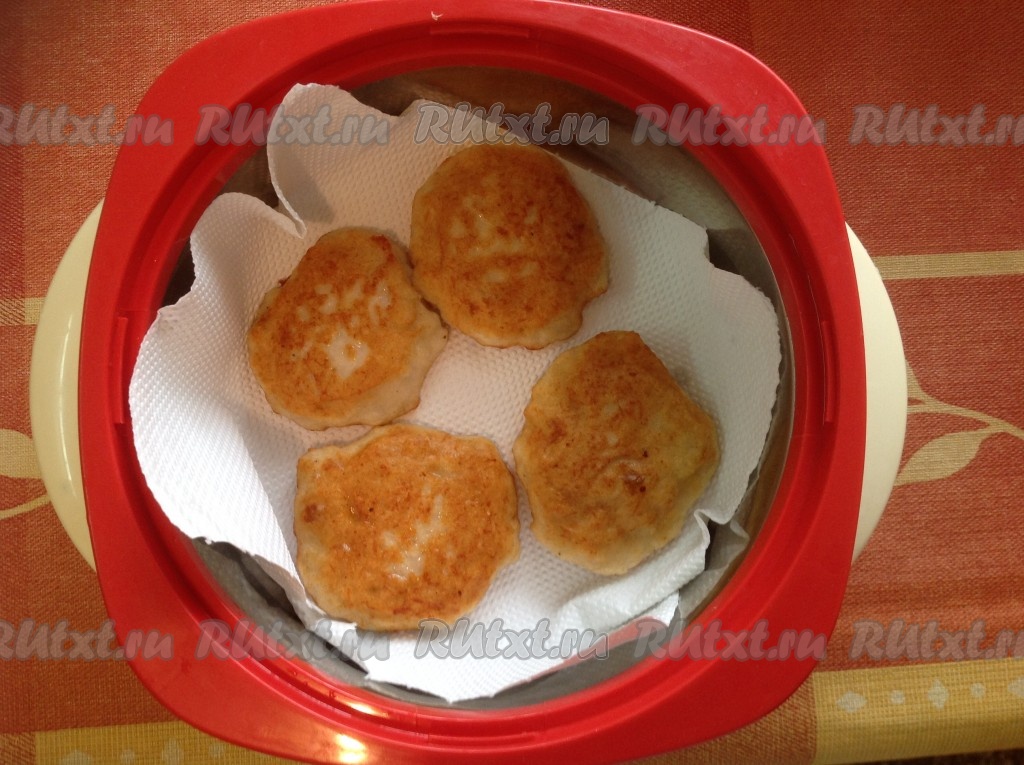 Выкладываем оладьи в емкость с бумажным полотенцем, чтобы собрать излишки масла. Я использую миску-термос для того, чтобы оладьи подольше оставались тёплыми.