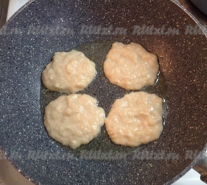 Через 2-3 минуты, как только оладьи подрумянятся с одной стороны, переворачиваем их.
