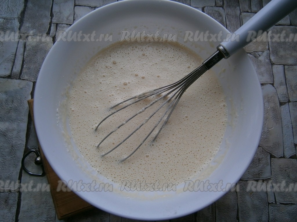 Добавляя муку, ориентируйтесь на густоту замешиваемого теста. Должно получиться льющееся, но не слишком жидкое тесто. Оставить тесто при комнатной температуре на 10 минут.