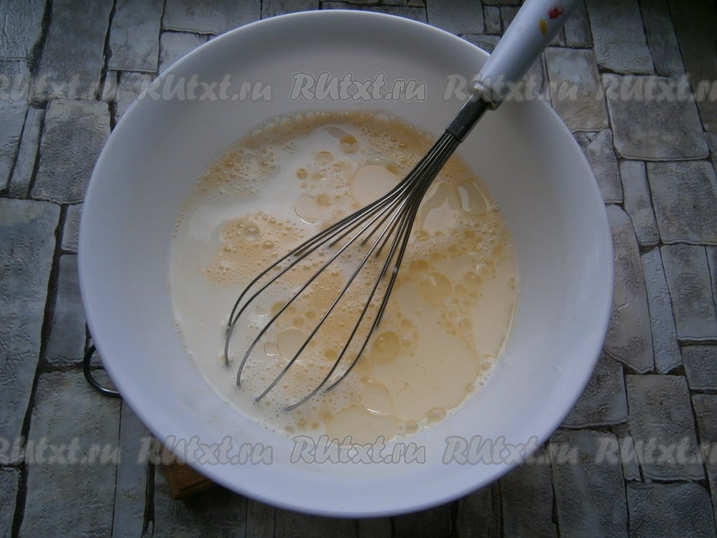 Влить в яичную смесь тёплое молоко (температура молока должна быть градусов 38-40) и растительное масло, взбить венчиком до однородности.