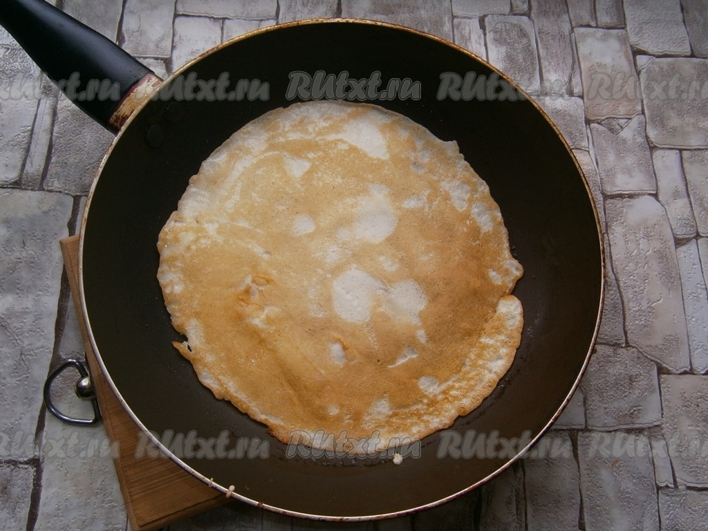 Жарить блинчик до румяности с двух сторон (примерно по 1 минуте с каждой стороны), затем переложить тонкий блин на тарелку. Периодически перемешивая блинное тесто в миске и смазывая сковороду перед выпечкой очередного блина только по мере необходимости, постепенно пожарить все блинчики, складывая их горкой на тарелку.