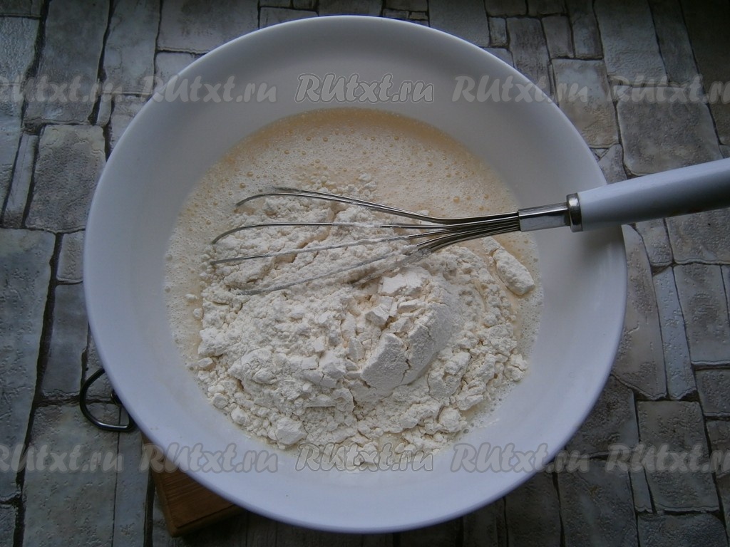 Далее частями всыпать просеянную муку, каждый раз полностью вмешивая её в блинное тесто.