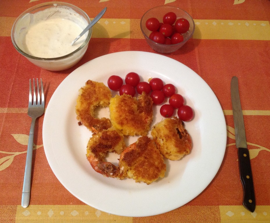 Подаём тигровые креветки, приготовленные в кляре, со сметанным соусом и овощами.