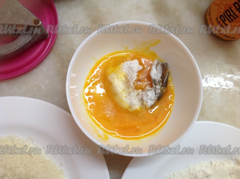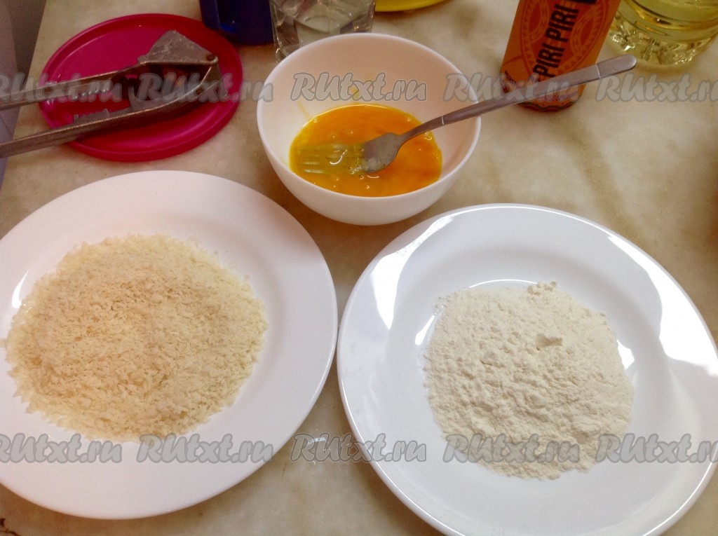 Подготовим продукты для кляра в трёх емкостях - муку, взбитое яйцо и панировочные сухари.