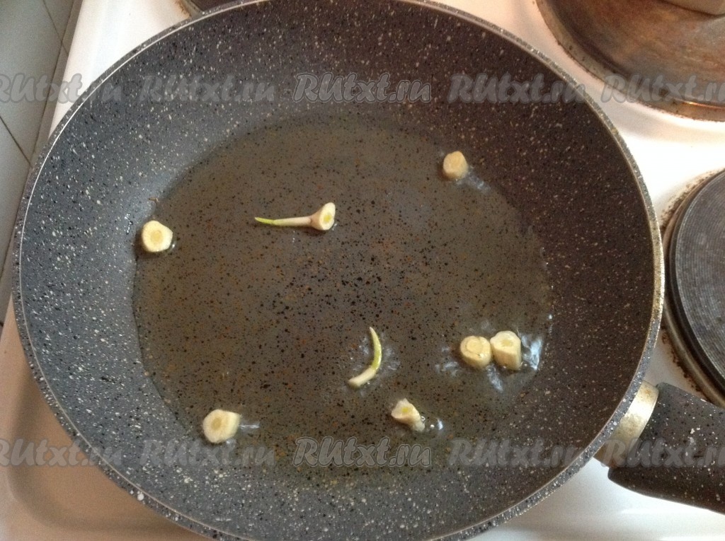 Ставим сковороду на огонь и наливаем подсолнечное масло. Кладём нарезанный чеснок и обжариваем его 2-3 минуты, затем удаляем чеснок со сковородки. Чесночное масло готово!