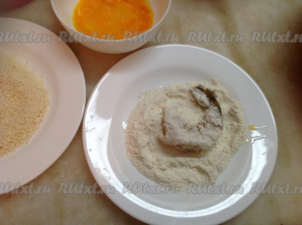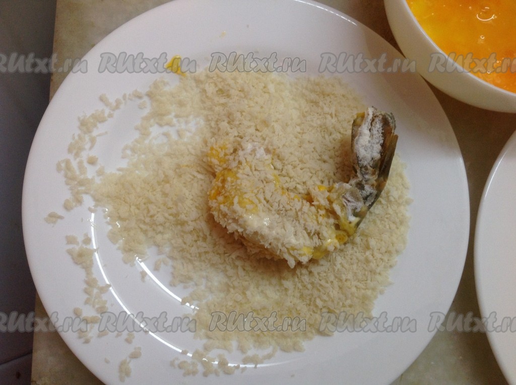 Опускаем креветки по очереди в каждую из трёх ёмкостей: мука, яйцо и сухари.