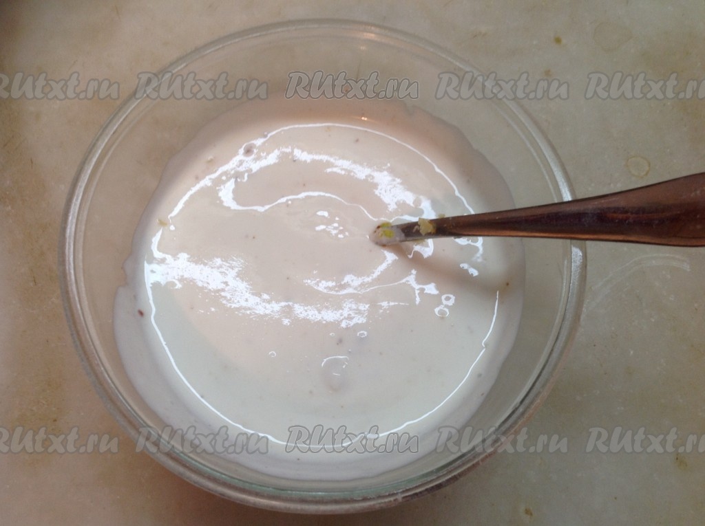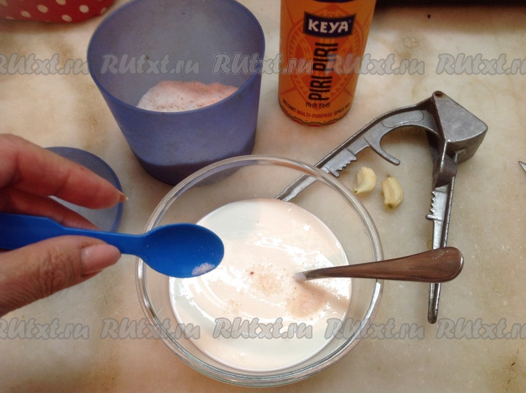 Теперь займёмся соусом. В сметану добавляем немного соли, чеснок, пропущенный через пресс, специи по вкусу. Хорошо перемешиваем - наш сметанный соус готов!