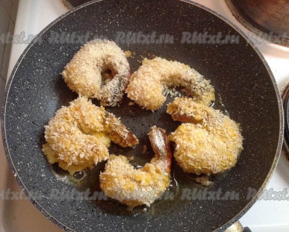 Через несколько минут переворачиваем наши креветки на другую сторону и поджариваем до золотистой корочки с другой стороны. Общее время обжаривания тигровых креветок в кляре 7-8 минут.