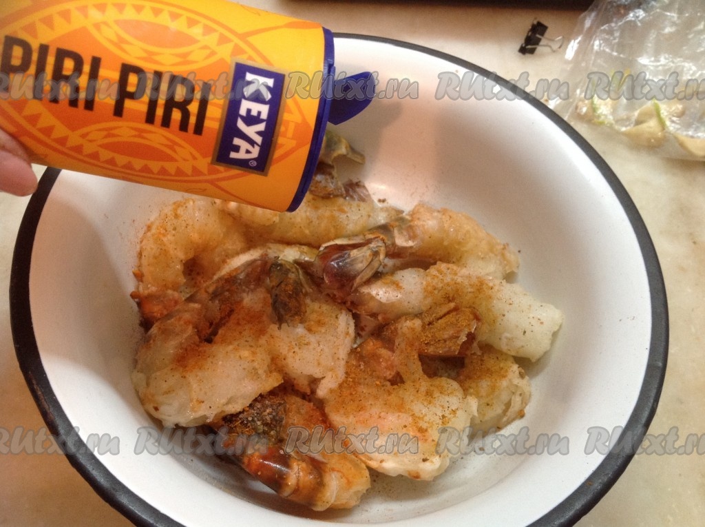 Посыпаем креветки солью и специями для морепродуктов (у меня это индийская смесь специй PIRI PIRI, в состав которой входят: перец чили, чёрный перец, орегано, петрушка, соль, сухой чеснок, лук, сахар, порошок тамаринда).