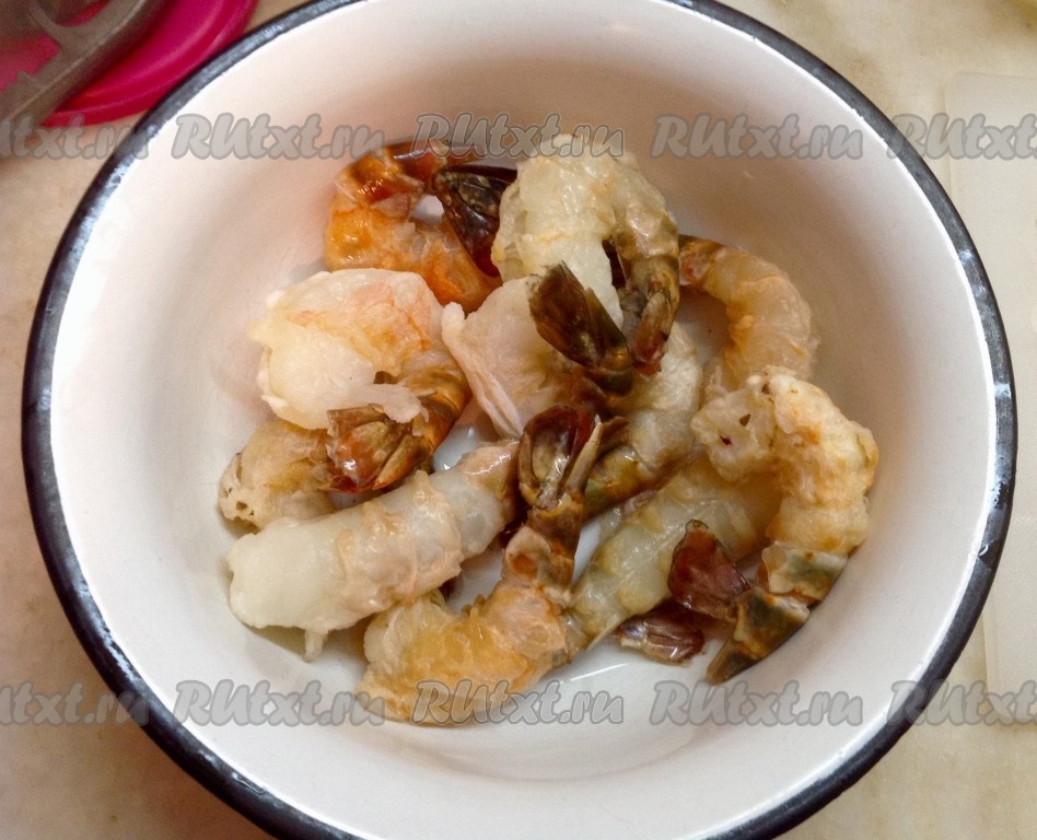 Тигровые креветки моем и складываем в отдельную посуду. Используем их вместе с хвостиками - это удобно при еде и красиво при подаче.
