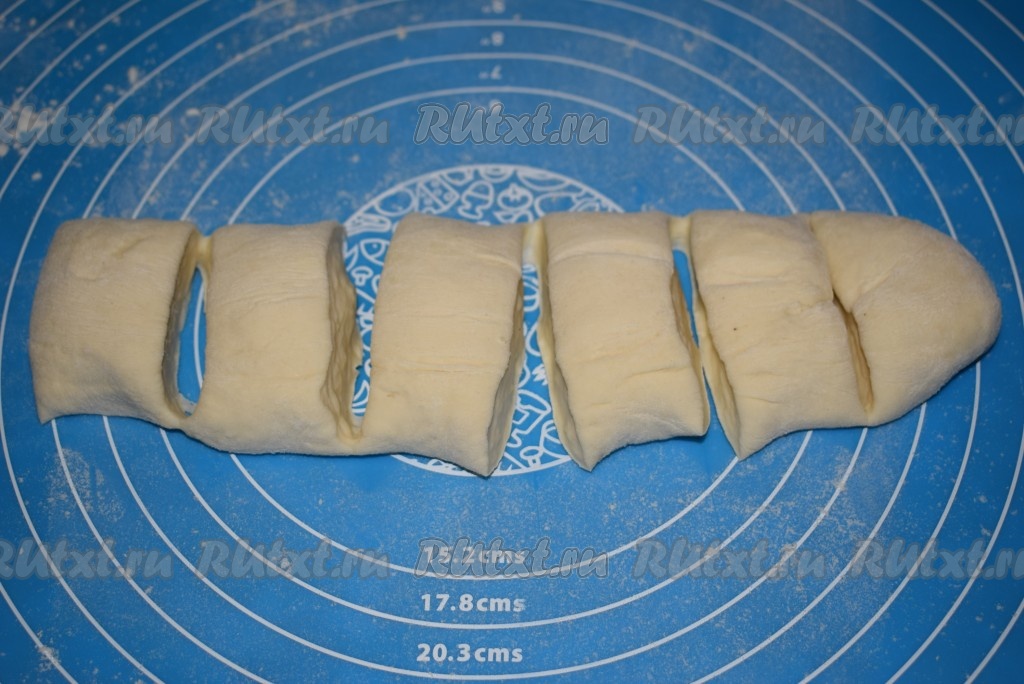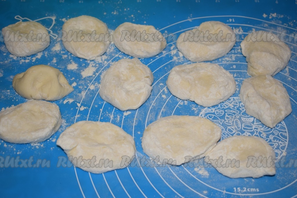 Получившиеся 14 частей теста обмакиваем в муку с двух сторон.