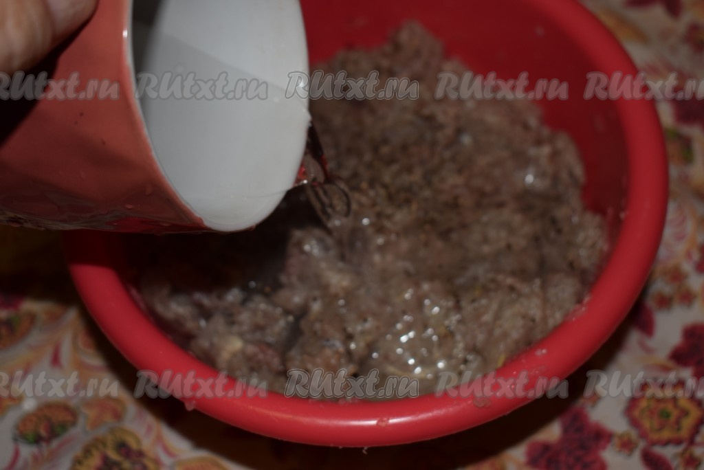 К получившемуся фаршу добавим ледяную воду, еще раз перемешаем. Вода сделает начинку для чебуреков сочной.