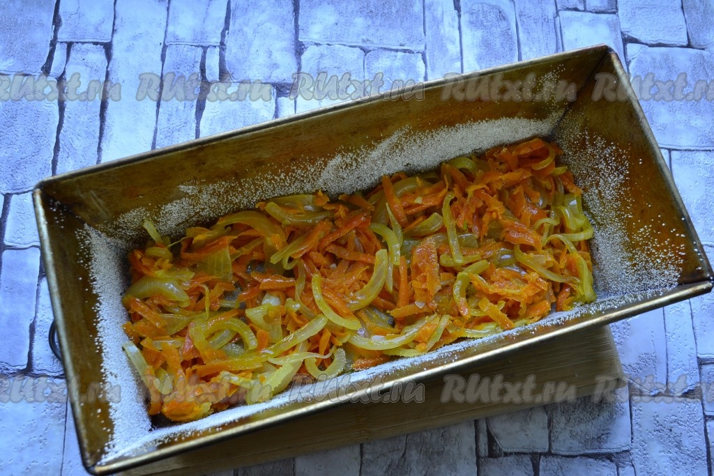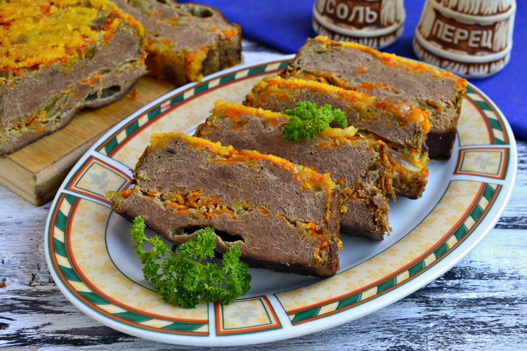 Далее равномерно распределить оставшиеся овощи, посолить, поперчить, выложить оставшийся фарш из печени.
