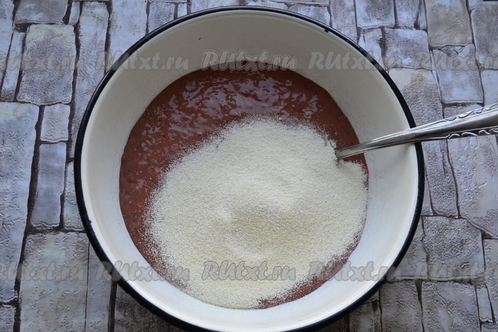 Измельчить печень до состояния фарша, переложить в миску. Если нет блендера, можно пропустить печень через мясорубку. К перекрученной печени всыпать 0,5 стакана манной крупы.