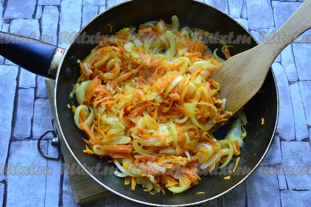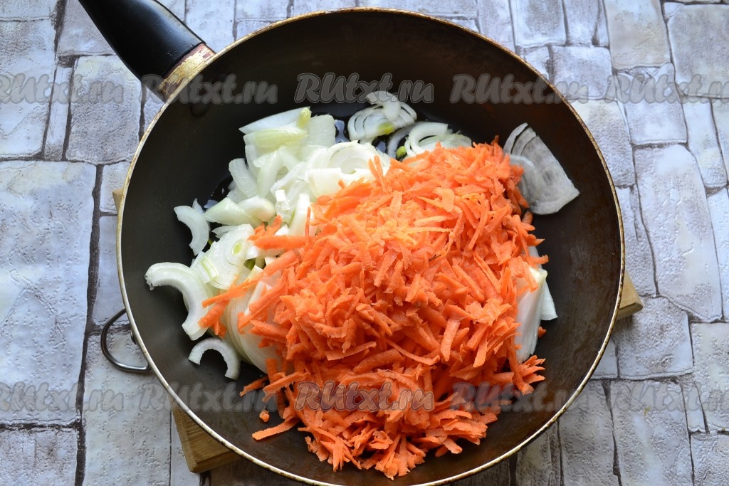 В сковороду с растительным маслом выложить очищенный лук, нарезанный полукольцами, и очищенную морковь, натертую на крупной терке.