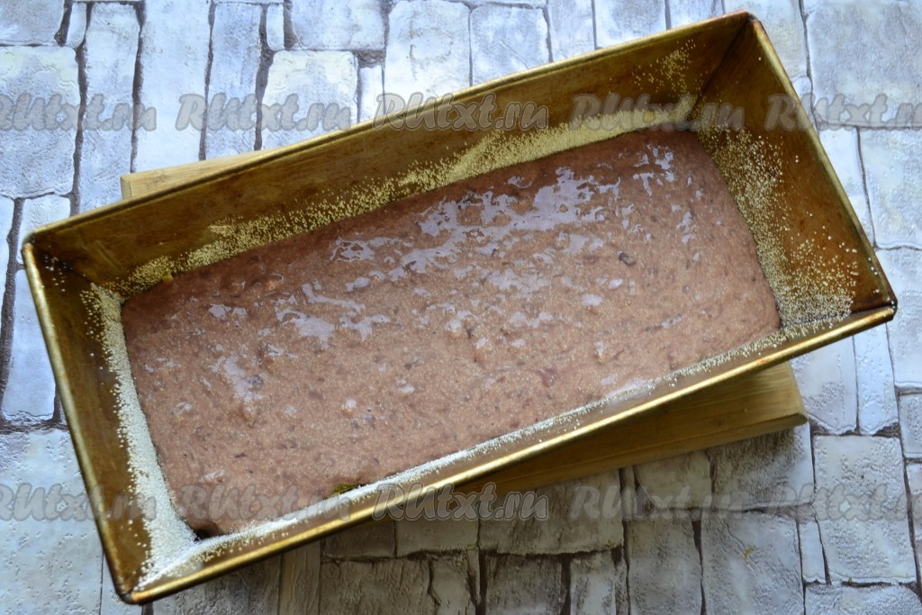 Форму для запекания (у меня форма для кекса размером 26х12 см) чуть смазать растительным маслом и обсыпать манной крупой. Выложить в форму половину овощей, посолить их сверху и поперчить.