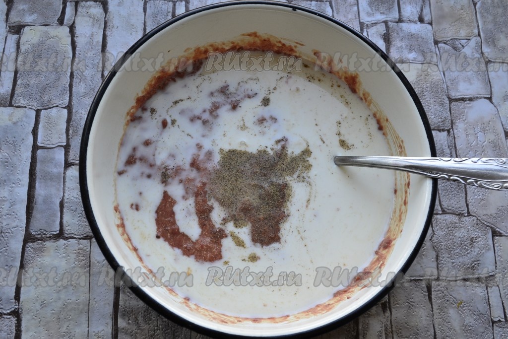 Перемешать получившуюся массу, влить молоко, добавить соль и чёрный молотый перец, снова перемешать печеночный фарш, накрыть миску пленкой и поместить в холодильник на 30 минут.