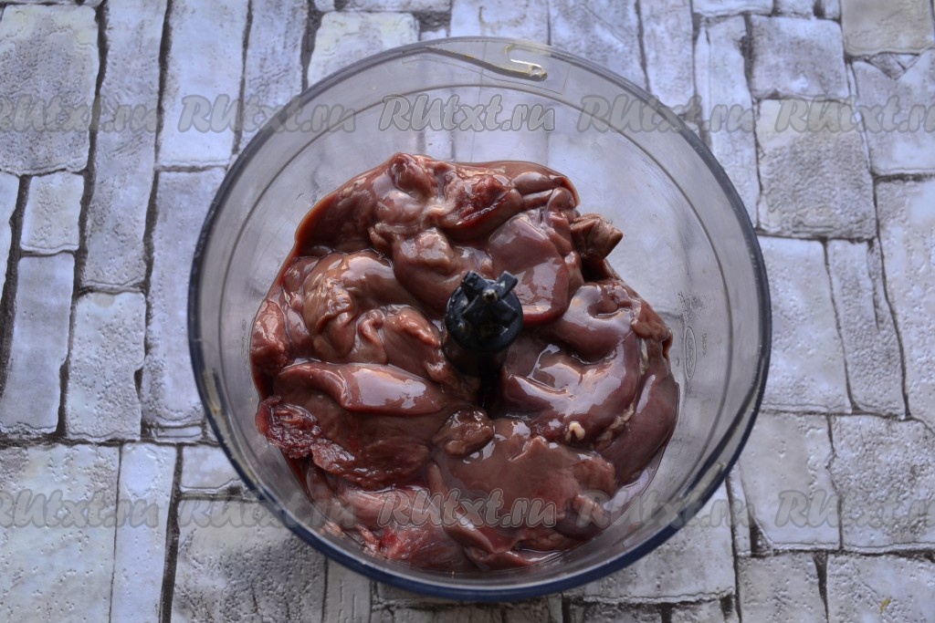 Куриную печень вымыть, дать стечь воде, поместить в чашу блендера.