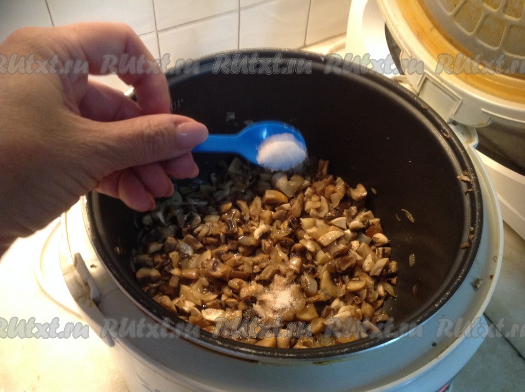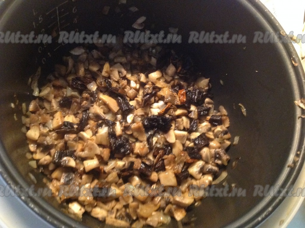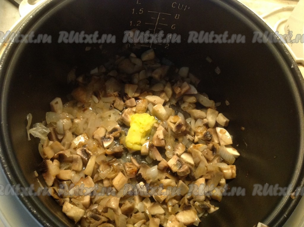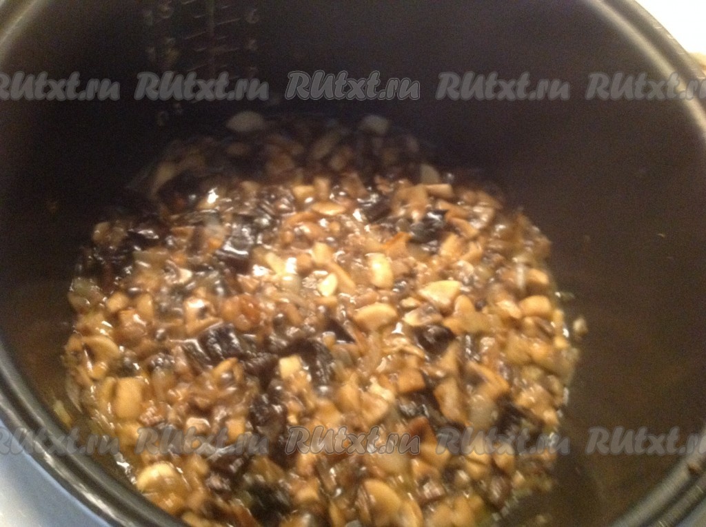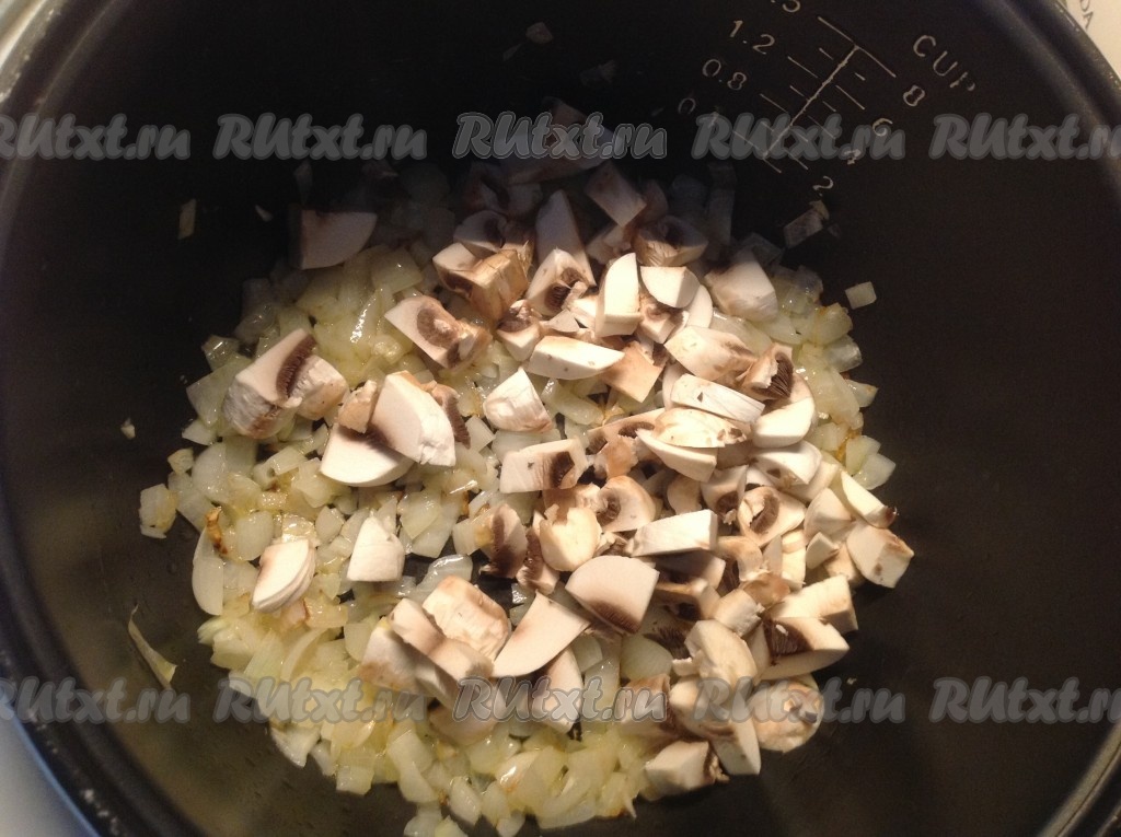 Выкладываем нарезанные грибы в чашу мультиварки к обжаренному луку.