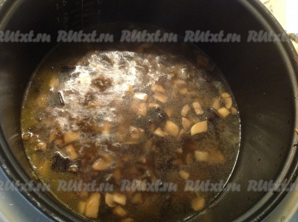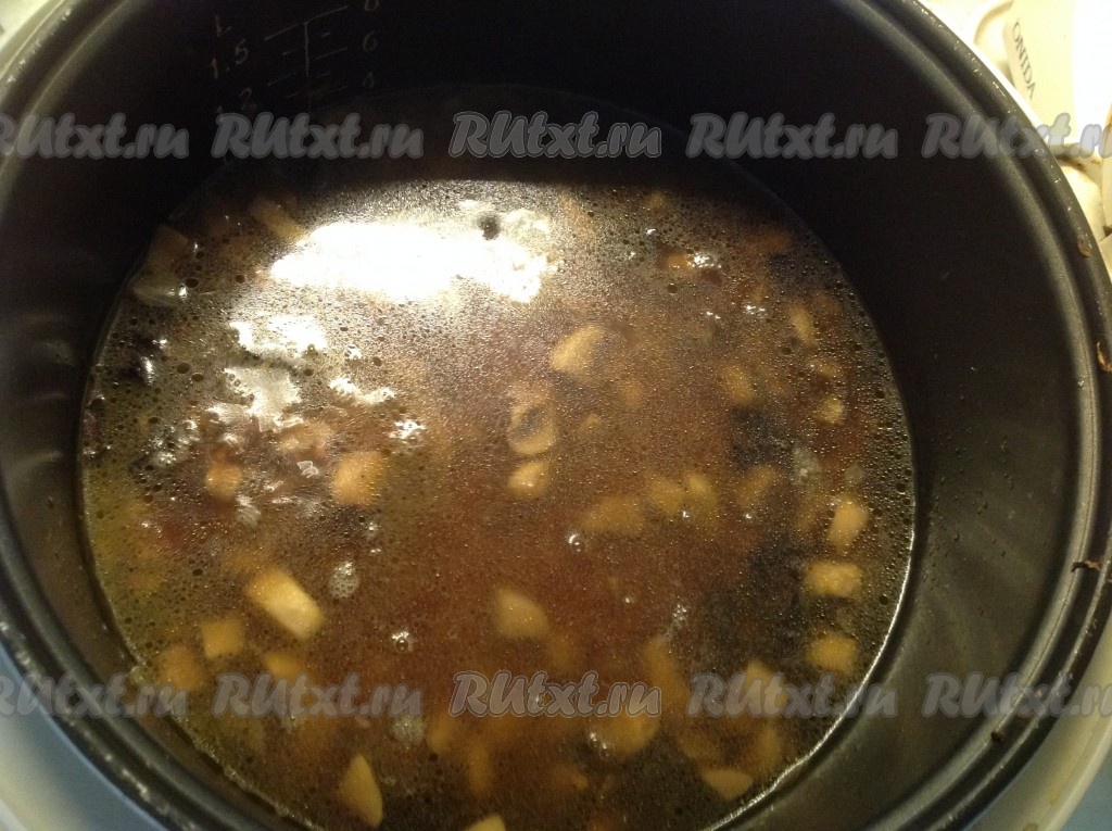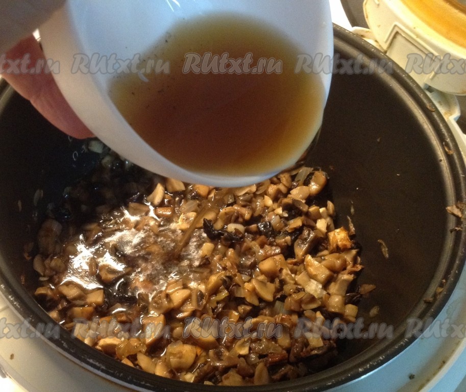 Затем доливаем воду, в которой сухие грибы замачивались (добавляем не всю воду, в которой замачивались грибы, чтобы не попали мелкие крошки).