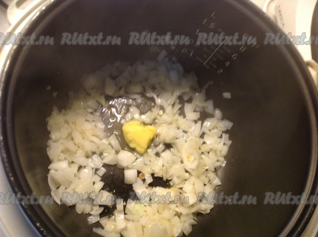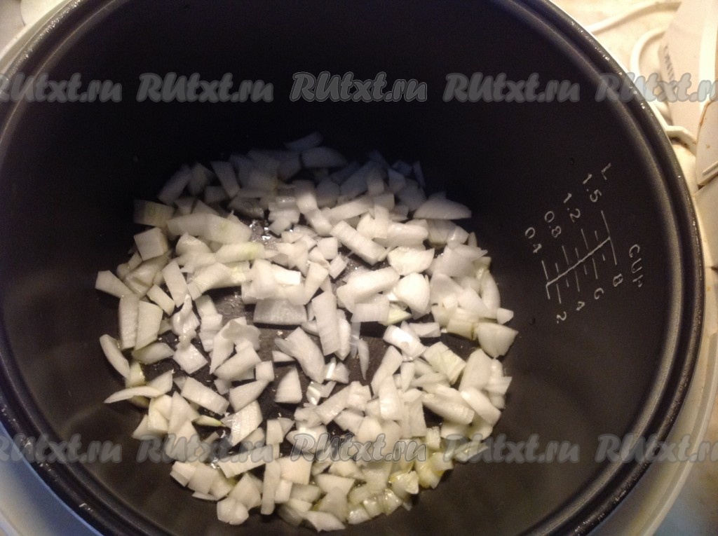Лук выкладываем в разогретую чашу мультиварки.