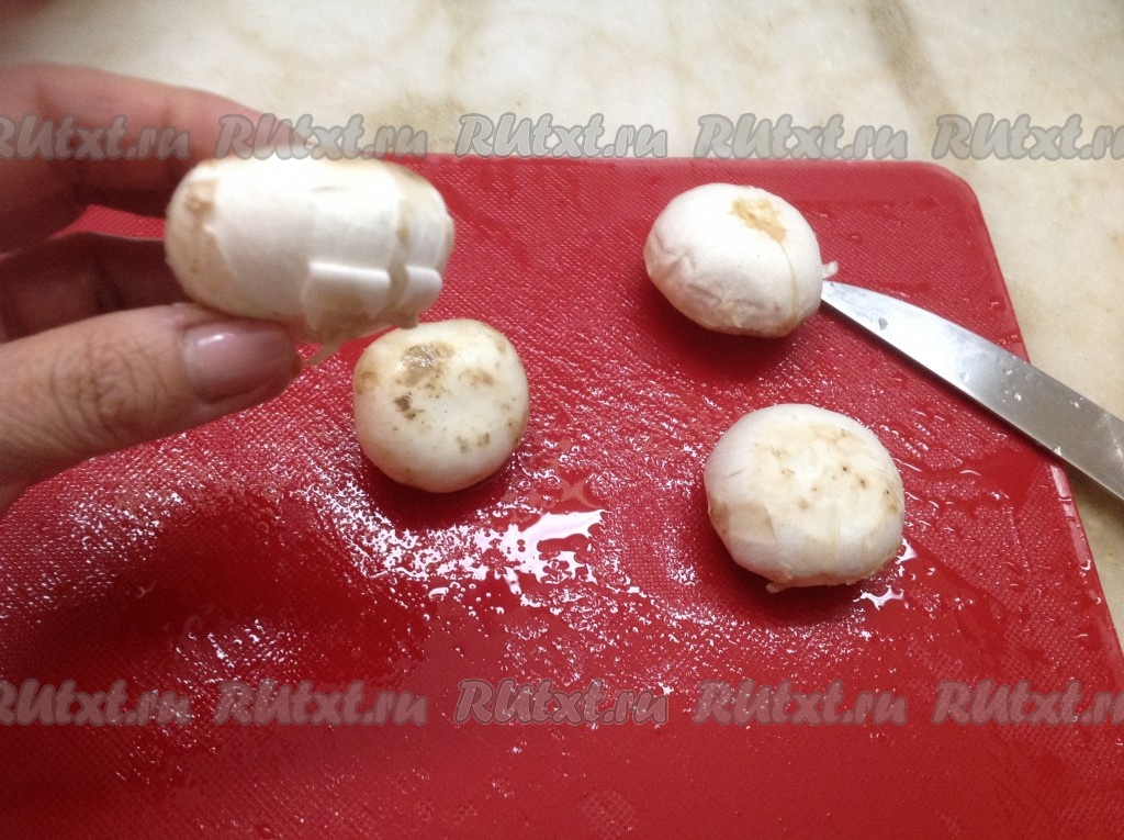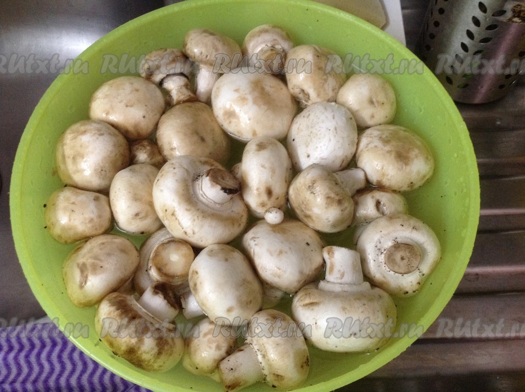 Замачиваем шампиньоны в воде, а затем очищаем.