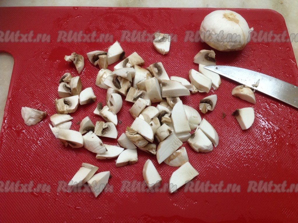 Пока жарится лук, нарезаем шампиньоны.