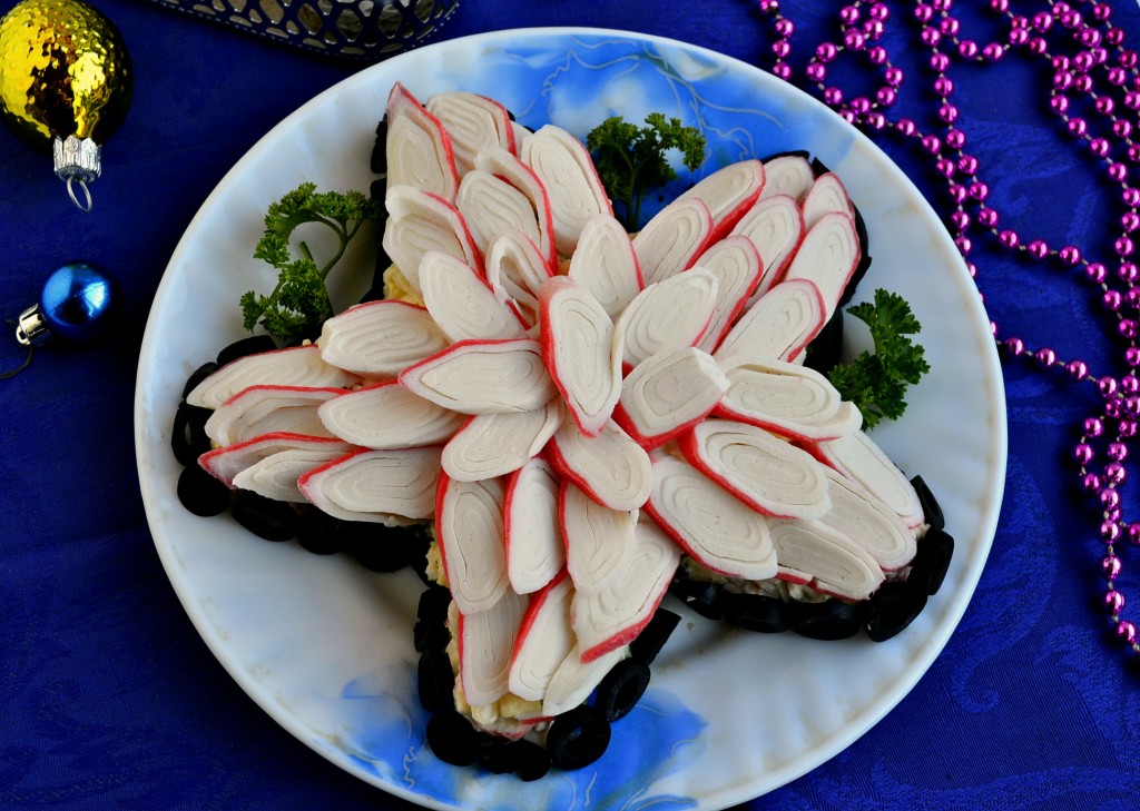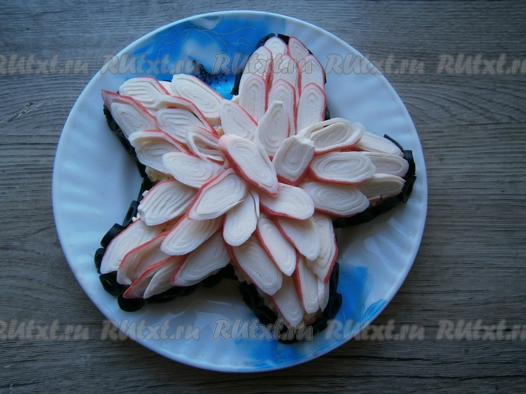 Бока салата "Морская звезда", для того чтобы блюдо выглядело более эффектно, можно украсить чёрными оливками, нарезанными на колечки.