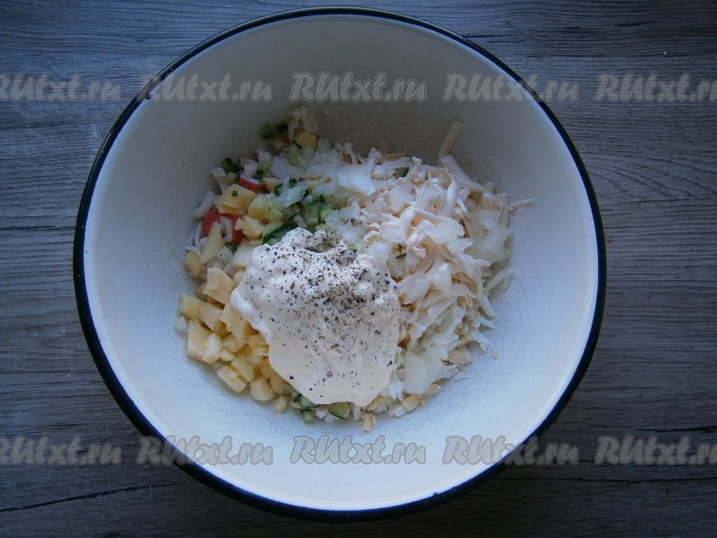 Добавить майонез, посолить и поперчить по вкусу.